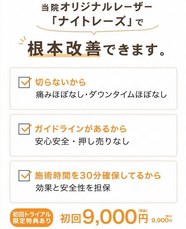 初回9,900円で切らないレーザー治療!痛みもダウンタイムもほぼなし。治療当日から飲食もOKです。施術も30分確保で効果と安全性を担保しています。
