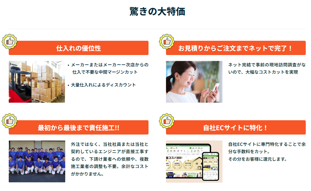 値段が安かったのはもちろんですが、とにかくメールの返信が早くてストレスがなかったです。製品選びに迷いましたがすぐに見積もりを3種類作ってくださるなど施工日の決定まで早かったです。当日のエンジニアさんもサクサクと作業していただき質問等しても製品の知識もあり不安になる事が一切有りませんでした。