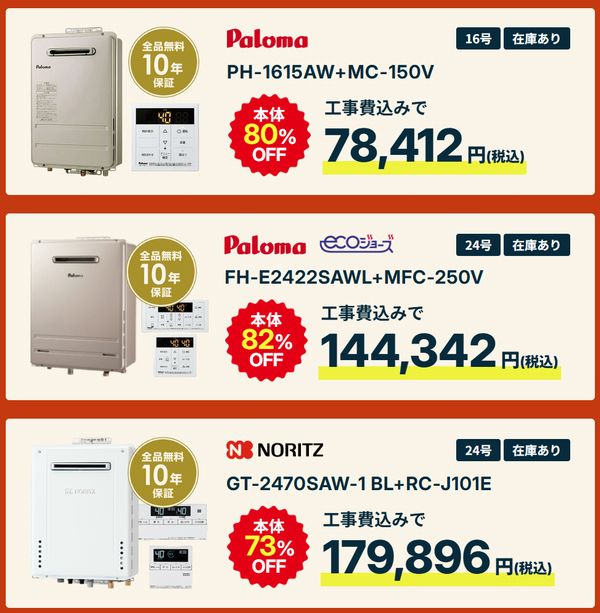 ノーリツ、パロマ、リンナイ、コロナ、三菱、パナソニック |